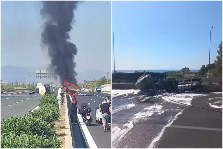 Το βυτιοφόρο ανετράπη στην Εθνική Αθηνών – Κορίνθου κοντά στην Κινέττα και άμεσα ξέσπασε πυρκαγιά στο μπροστινό τμήμα.