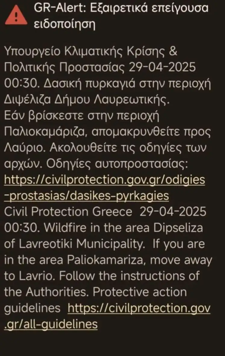 Στις 12.30 μετά τα μεσάνυχτα ενεργοποιήθηκε το 112 καλώντας τους κατοίκους της περιοχής Παλιοκαμάριζα να απομακρυνθούν προς Λαύριο.