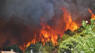 Οι άνεμοι που πνέουν στην περιοχή φθάνουν τα 8 μποφόρ, γεγονός που δυσκολεύει τον έλεγχο της πυρκαγιάς.
