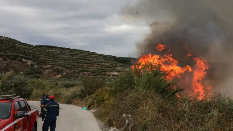 Η φωτιά καίει σε χορτολιβαδική έκταση νοτιοδυτικά των Μελεσών του Δήμου Αρχανών-Αστερουσίων στο Ηράκλειο.