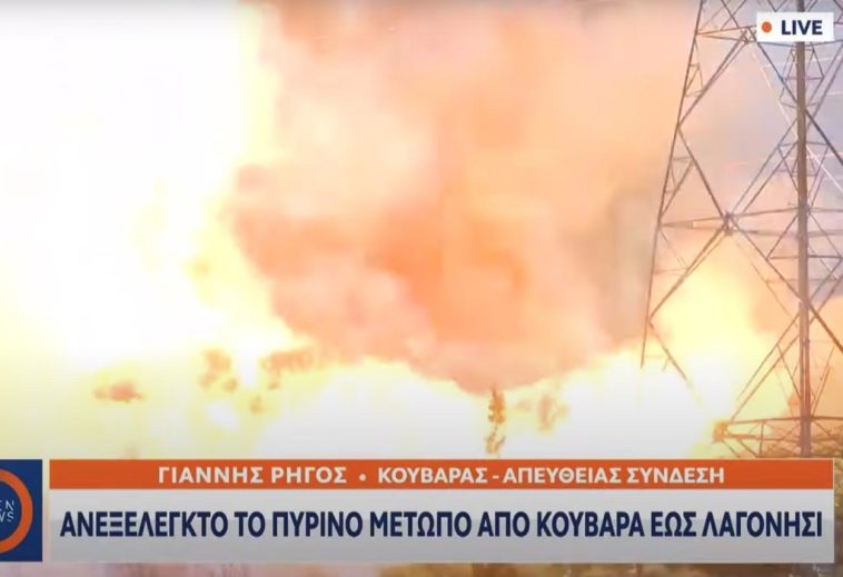 Ανεξέλεγκτη καίει η μεγάλη φωτιά στον Κουβαρά Αττικής που ξέσπασε το μεσημέρι της Δευτέρας.