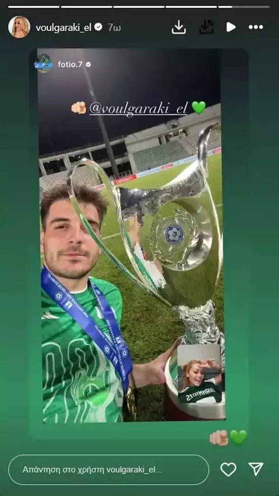 Το αγαπημένο ζευγάρι δεν διστάζει πλέον να εκφράζει ανοιχτά τον έρωτά του μέσα από τα social media. Στη αγαπημένη του σύντροφο, Ελένη Βουλγαράκη, αφιέρωσε ο Φώτης Ιωαννίδης το Κύπελλο Ελλάδας που κατέκτησε ο Παναθηναϊκός απέναντι στον Άρη το βράδυ του Σαββάτου (25/5). Ο ποδοσφαιριστής του «Τριφυλλιού» αμέσως μετά το τέλος του αγώνα φωτογραφήθηκε αγκαλιά με το τρόπαιο των νικητών, αναρτώντας το στιγμιότυπο στον προσωπικό του λογαριασμό στο Instagram, ταγκάροντας την αγαπημένη του. Με αυτόν τον τρόπο ο Φώτης Ιωαννίδης θέλησε να αφιερώσει τη μεγάλη νίκη και το κύπελλο στην Ελένη Βουλγαράκη. Λίγη ώρα αργότερα, εκείνη απάντησε στον σύντροφό της με μια σέλφι, στην οποία τη βλέπουμε να κάνει το σήμα της νίκης φορώντας μπλουζάκι του Παναθηναϊκού. Είναι πλέον φανερό πως το αγαπημένο ζευγάρι, που στην αρχή δεν ήθελε να δημοσιοποιεί τίποτα που να αφορά στη μεταξύ τους σχέση, δεν διστάζει να εκφράζει ανοιχτά τον έρωτά του μέσα από τα social media.