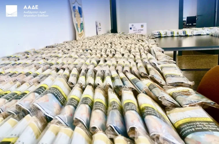 Βρήκαν: 395.690 ευρώ, 56.590 δολάρια, 35.000 Ντιρχάμ ΗΑΕ και 103.100 Ρούβλια Ρωσίας αλλά και 1.385.240 τεμάχια τσιγάρων και 95 kg καπνού, 660 lt παράνομων αλκοολούχων προϊόντων και 33495 προϊόντα μαϊμού.