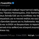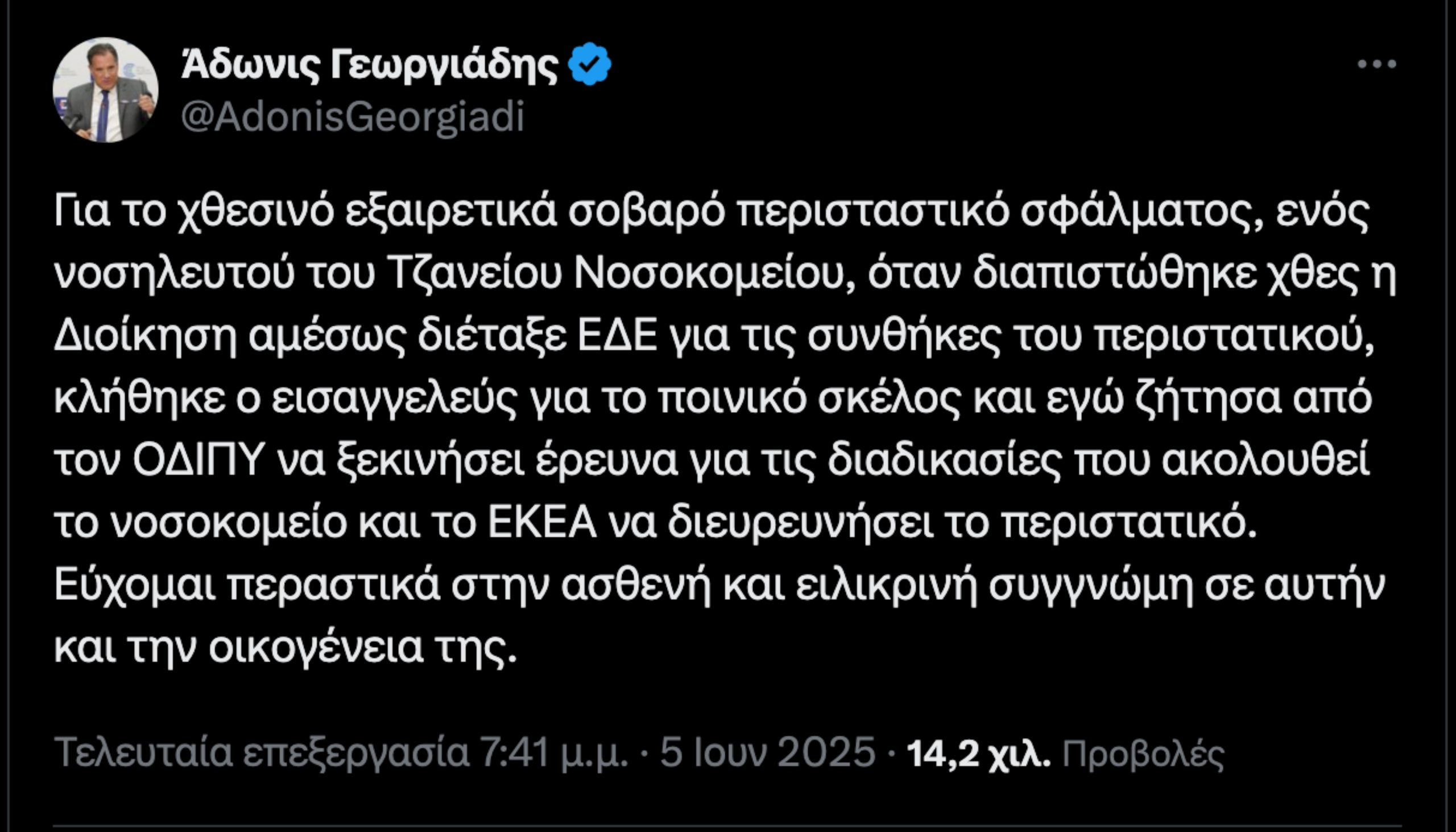 - Ο κ. Γεωργιάδης τοποθετήθηκε για το συμβάν με ανάρτησή του στα κοινωνικά δίκτυα, ζητώντας «ειλικρινή συγγνώμη από την ασθενή και την οικογένειά της».