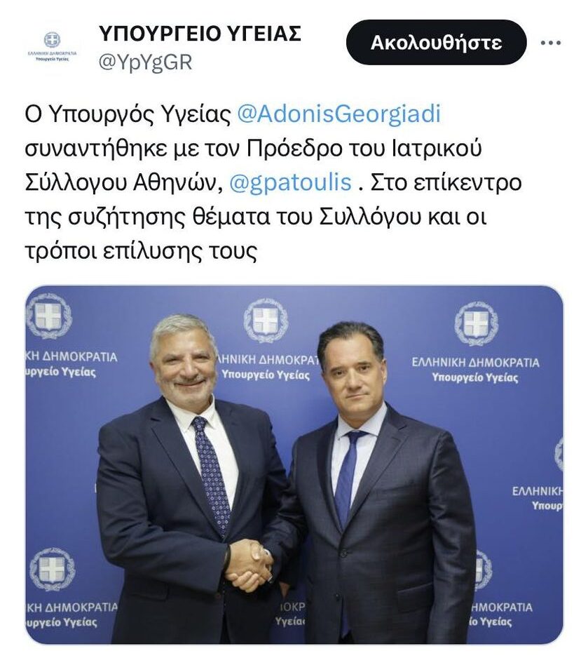 - O υπουργός Υγείας Άδωνις Γεωργιάδης και η αναπληρώτρια υπουργός Ειρήνη Αγαπηδάκη συναντήθηκαν με τον πρόεδρο και αντιπρόεδρο του ΕΟΔΥ, Χριστάκη Χατζηχριστοδούλου και Στέλιο Ορφανό και στο επίκεντρο της συζήτησης τέθηκαν τα νέα δεδομένα για την πορεία του κορoνοϊού στη χώρα, όπως ενημερώνει με δημοσίευση στο Χ (πρώην tweet) το Υπουργείο Υγείας.