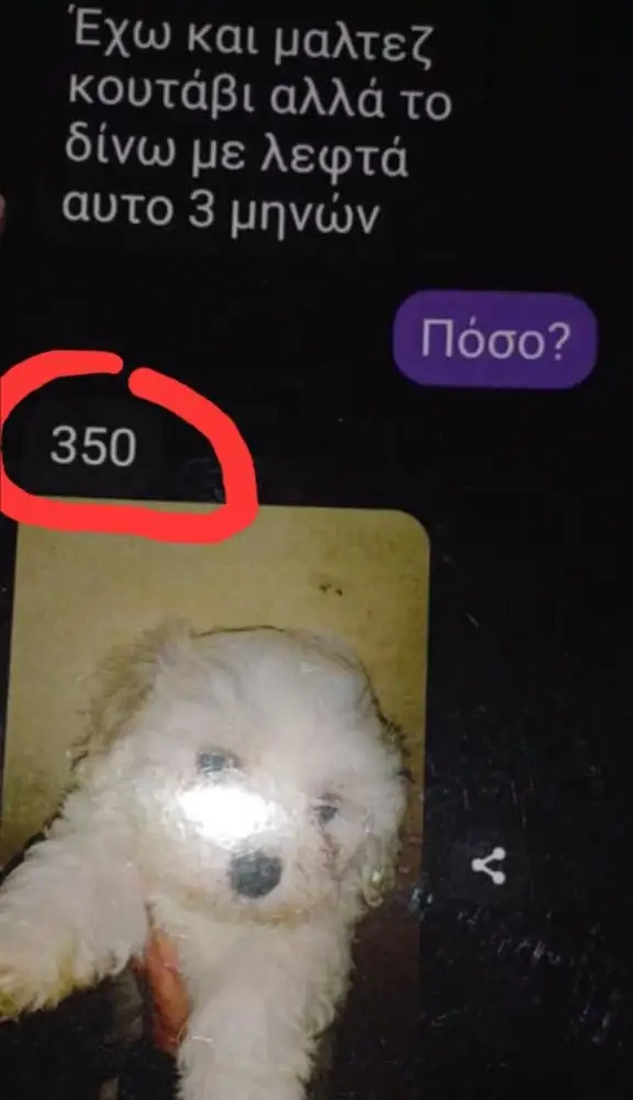 Σύμφωνα με όσα υποστηρίζει η διασώστρια, ένα μαλτέζ που η αξία του είναι περίπου στα 1.500 με 1.800 ευρώ από τον παράνομο έμπορο θα το βρει κανείς 350 ευρώ αλλά πρόκειται για ζώα τα οποία προέρχονται κάποιες φορές από αιμομιξίες και άλλες φορές είναι άρρωστα γιατί η αναπαραγωγή τους αλλά και οι συνθήκες διαβίωσης που έχουν δεν είναι αυτές που θα έπρεπε.