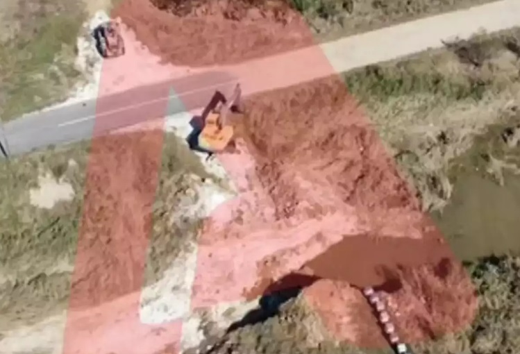 Δείτε λοιπόν την αποκαλυπτική εικόνα που έχει καταγράψει drone στη γέφυρα του ποταμού Καλέντζη λίγο έξω από τον Παλαμά, όπου φαίνεται πως στο ανάχωμα που κρατάει τα νερά του ποταμού υπάρχει ένα μεγάλο σκάμμα που το κόβει στη μέση και δίπλα ακόμα το χωματουργικό μηχάνημα!