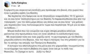 Συγκινημένη από αυτήν την αλληλεπίδραση, η Καλογήρου αποφάσισε να χαρίσει σε όλα αυτά τα άτομα μια φωτογραφία του Βασίλη σε παιδική ηλικία στην Βέροια με τον γνωστό καλαθοσφαιριστή Παναγιώτη Φασούλα, με την «ευτυχία του», να είναι»αποτυπωμένη στα μάτια και στο χαμογελάκι του» όπως γράφει η ίδια.