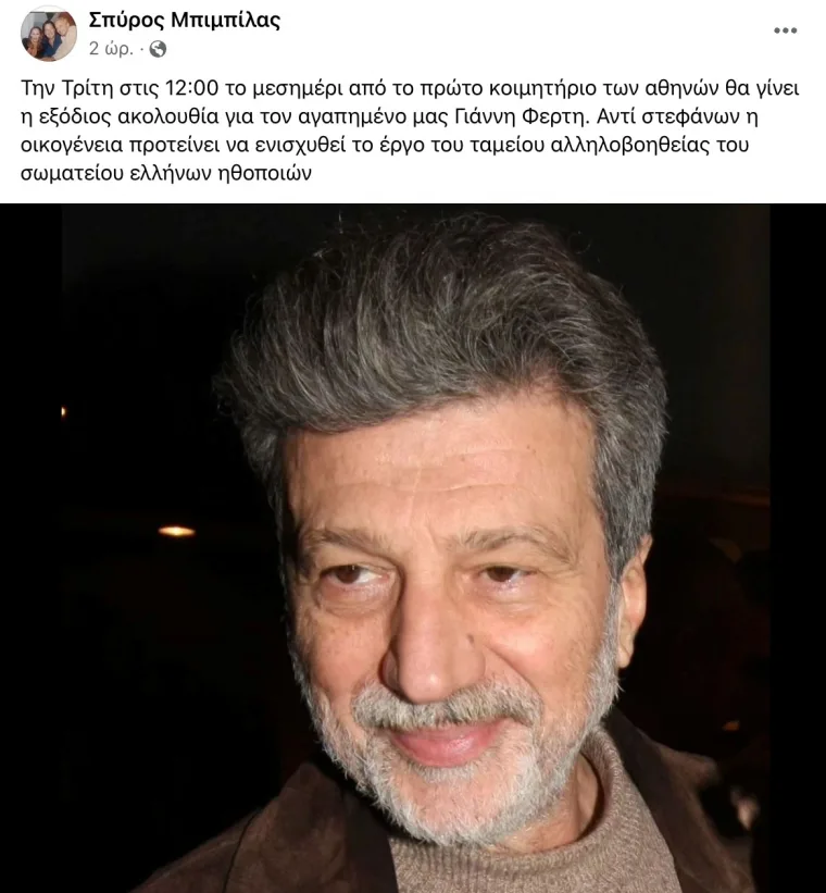 Έφυγε από τη ζωή την Κυριακή 14/04 σε ηλικία 86 ετών ο Γιάννης Φέρτης βυθίζοντας στην θλίψη όλη την Ελλάδα. Ο Σπύρος Μπιμπίλας ο οποίος αποκάλυψε το δυσάρεστο γεγονός, με νέα του ανάρτηση στα social media έκανε γνωστό πως η κηδεία του ηθοποιού θα γίνει την Τρίτη 16/04 στο Α’ Νεκροταφείο Αθηνών, ενώ παράλληλα έγραψε πως επιθυμία της οικογένειας είναι αντί στεφάνων, να ενισχυθεί το έργο του ταμείου αλληλοβοηθείας του Σ.Ε.Η. «Την Τρίτη στις 12:00 το μεσημέρι από το πρώτο κοιμητήριο των Αθηνών θα γίνει η εξόδιος ακολουθία για τον αγαπημένο μας Γιάννη Φέρτη. Αντί στεφάνων η οικογένεια προτείνει να ενισχυθεί το έργο του ταμείου αλληλοβοηθείας του σωματείου Ελλήνων ηθοποιών», έγραψε ο Σπύρος Μπιμπίλας για την κηδεία του Γιάννη Φέρτη.