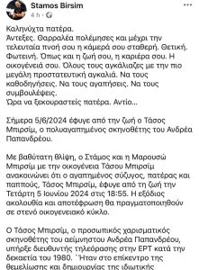 «Με βαθύτατη θλίψη, ο Στάμος και η Μαρουσώ Μπιρσίμ με την οικογένεια Τάσου Μπιρσίμ ανακοινώνει ότι ο αγαπημένος σύζυγος, πατέρας και παππούς, Τάσος Μπιρσίμ, έφυγε από τη ζωή την Τετάρτη 5 Ιουνίου 2024 στις 18:55. Η εξόδιος ακολουθία και αποτέφρωση θα πραγματοποιηθούν σε στενό οικογενειακό κύκλο» αναφέρει σε ανάρτησή του στο Facebook ο Στάμος Μπιρσίμ.