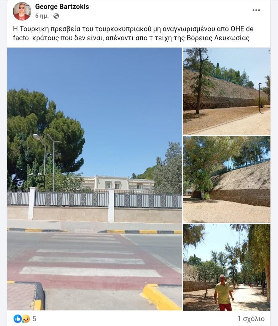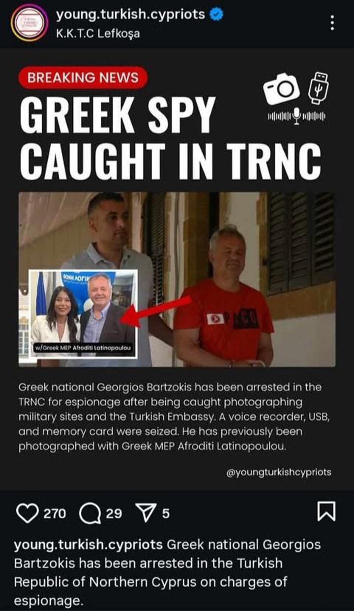 - Σύμφωνα με τα όσα έχουν δημοσιευθεί και σε προφίλ φιλικό προς την ρητορική της Άγκυρας για το Κυπριακό (προώθηση της διχοτόμησης δηλαδή), το πρόσωπο αυτό, που έχει αναλάβει συνήγορος υπεράσπισης των συγγενών των θυμάτων της τραγωδίας των Τεμπών, συνελήφθη από την Αστυνομία, όταν πιάστηκε να φωτογραφίζει και να βιντεοσκοπεί με το κινητό του και με κάμερα στρατιωτικές εγκαταστάσεις και την λεγόμενη πρεσβεία της Τουρκίας στο βόρειο κομμάτι του νησιού.