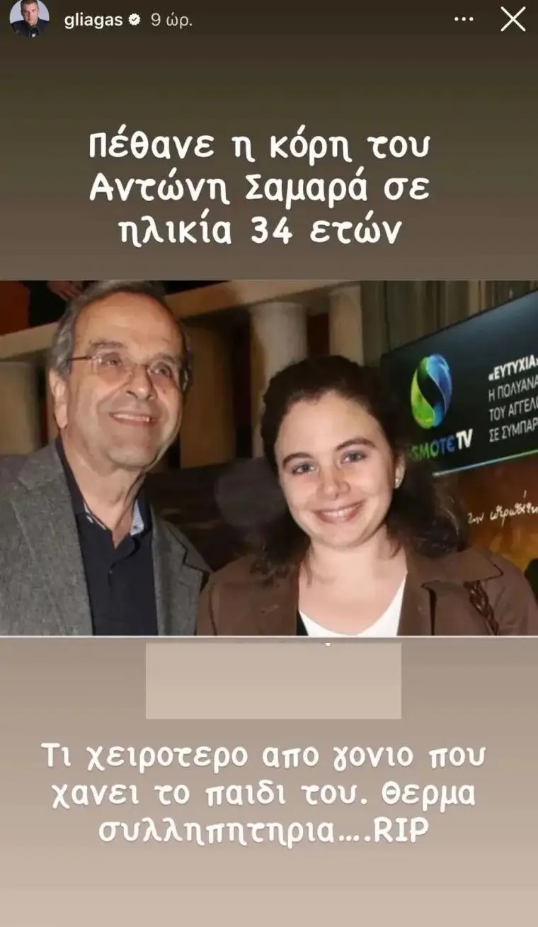 Από το πρωί σύσσωμος ο πολιτικός κόσμος έσπευσε να συλλυπηθεί την οικογένεια του Αντώνη Σαμαρά για την ανείπωτη τραγωδία που τη χτύπησε, ενώ τα δικά τους μηνύματα συμπαράστασης έστειλαν και αρκετοί δημοσιογράφοι. Μεταξύ αυτών και ο Γιώργος Λιάγκας, ο οποίος έκανε μία λιτή και ουσιαστική ανάρτηση στον προσωπικό του λογαριασμό στο Instagram.