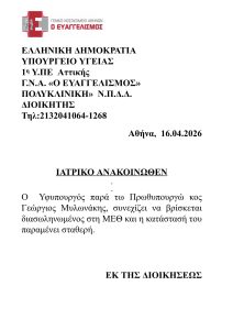 Το νοσοκομείο Ευαγγελισμός επιβεβαίωσε: «Ο Υφυπουργός παρά τω Πρωθυπουργώ κος Γεώργιος Μυλωνάκης, συνεχίζει να βρίσκεται διασωληνωμένος στη ΜΕΘ και η κατάστασή του παραμένει σταθερή».