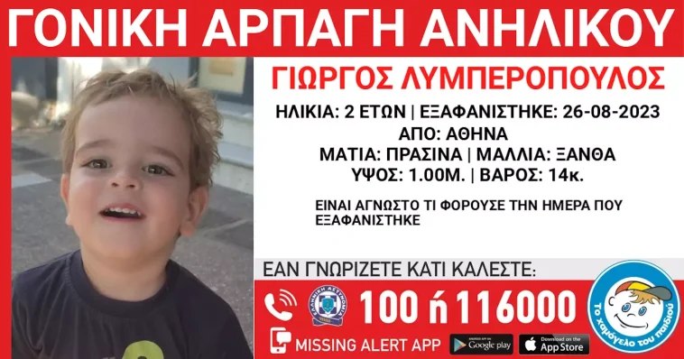 - Ωστόσο, οι έρευνες για τον εντοπισμό του συνεχίζονται και σήμερα (8.10.2023). Υπενθυμίζεται ότι ο Γιώργος Λυμπερόπουλος έχει ξανθά μαλλιά, πράσινα μάτια, ύψος 1 μέτρο και 14 κιλά βάρος. Είναι άγνωστο τι φοράει.