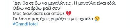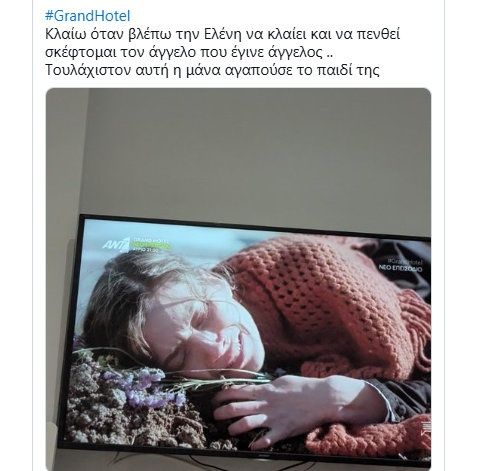 Αποθεώθηκε η Γιολάντα Καλογεροπούλου την οποία παρακολουθούμε ως Ελένη στην αγαπημένη σειρά του ΑΝΤ1, Grand Hotel καθώς όπως ορίζει το σενάριο, θρηνεί το νεκρό παιδί της.
