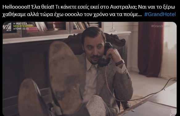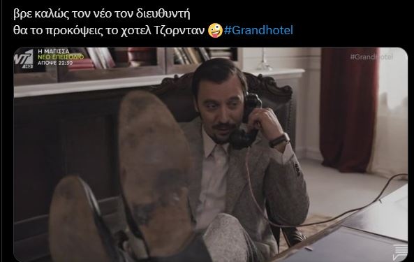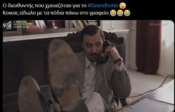Ο ίδιος, μιλούσε στο τηλέφωνο έχοντας τα πόδια πάνω στο γραφείο και φυσικά αυτό ήταν κάτι που δεν θα μπορούσε να περάσει ασχολίαστο και απαρατήρητο από τους τηλεθεατές που σχολιάζουν φανατικά τις σκηνές της σειράς Grand Hotel στο Twitter.