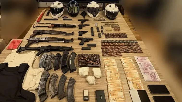 Στο οπλοστάσιο της εγκληματικής οργάνωσης βρέθηκαν και κατασχέθηκαν 5 πολεμικά τυφέκια “Καλάσνικοφ”, 5 πιστόλια, δεκάδες γεμιστήρες, εκατοντάδες φυσίγγια, αλεξίσφαιρα γιλέκα, taser, ρόπαλα, σιδερογροθιές, μεταλλικές ράβδοι, ανιχνευτής συσκευών παρακολούθησης, GPS–tracker
