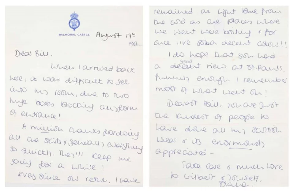 - Περιλάμβανε ακόμη ένα γράμμα της πριγκίπισσας Νταϊάνα τρεις εβδομάδες μετά τον βασιλικό γάμο, στο οποίο αστειευόταν ότι το κλίμα της Σκωτίας είχε μετατρέψει το μαύρισμά της από το ταξίδι του μέλιτος σε «γαλάζιο».Η Νταϊάνα και ο πρίγκιπας Κάρολος είχαν μόλις επιστρέψει στο Μπαλμόραλ μετά τον μήνα του μέλιτος στη Μεσόγειο με το βασιλικό γιοτ Britannia τον Αύγουστο του 1981.Στην αρχή δυσκολεύτηκε να μπει στο δωμάτιό της λόγω των κουτιών με φούστες και σκωτσέζικα ρούχα που της είχε στείλει ο αείμνηστος Pashley. Του έστειλε ένα γράμμα ευχαριστώντας τον για τα ρούχα που έφτιαξε για την παραμονής της στο Κάστρο.