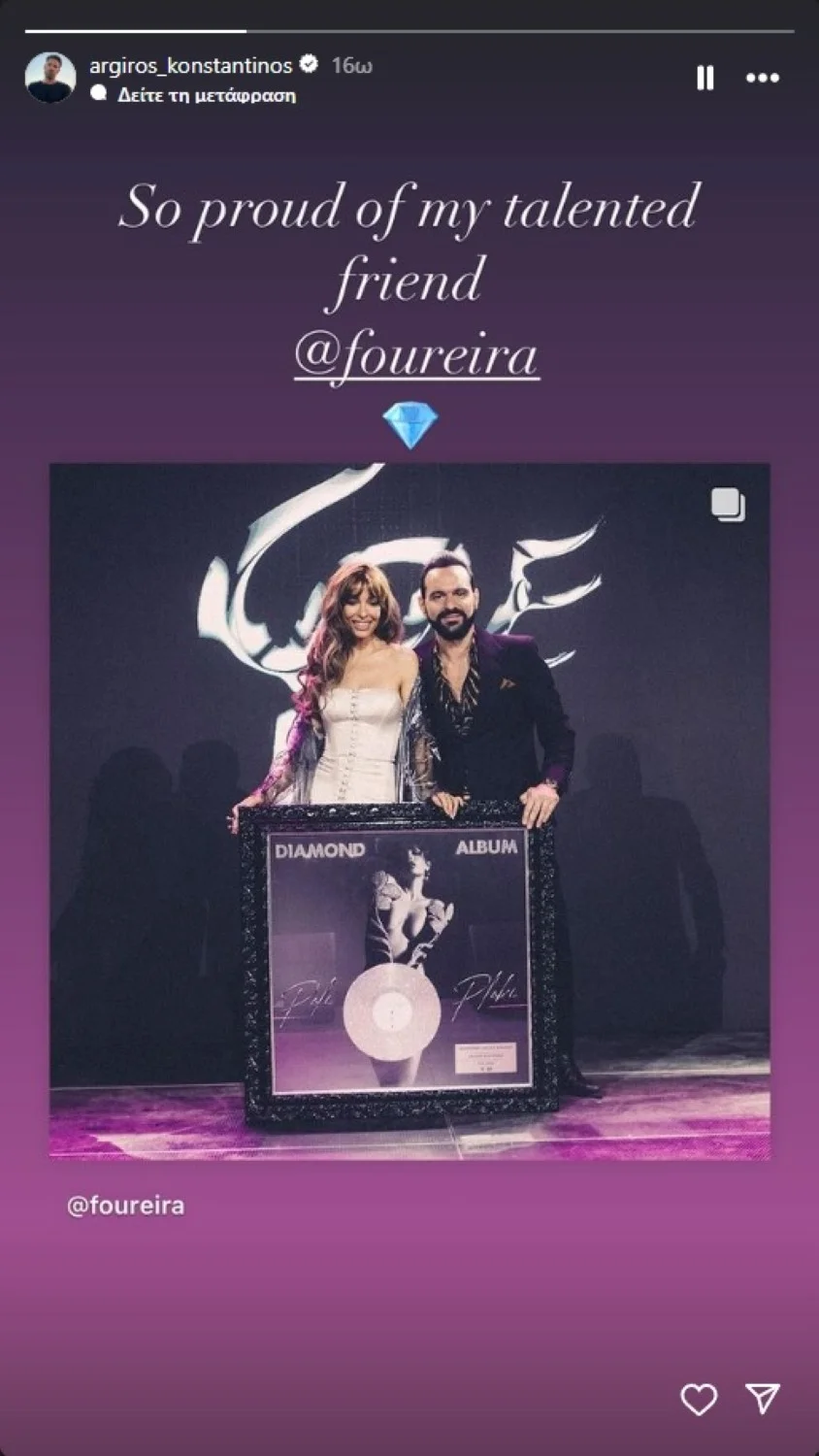 Τέλος στις φήμες περί «κόντρας» του με την Ελένη Φουρέιρα έδωσε ο Κωνσταντίνος Αργυρός με μία ανάρτησή του. Υπενθυμίζεται ότι οι δύο καλλιτέχνες μοιράστηκαν προ ημερών μία μάλλον άβολη στιγμή στα social media, με τους δύο τους να εκφράζουν αμφότεροι τη συγκίνησή τους, για την κατάκτηση του πρώτου διαμαντένιου άλμπουμ στην Ελλάδα. Μάλιστα, η Ελένη Φουρέιρα έκανε και σχετικό σχόλιο στην ανάρτηση του Κωνσταντίνου Αργυρού, γράφοντας «#2» και συνοδεύοντας το μήνυμά της με μία κόκκινη καρδιά, επισημαίνοντας στον συνάδελφό της με αυτόν τον τρόπο ότι το δικό της άλμπουμ πήρε τη σχετική πρωτιά, ενώ εκείνος ακολουθεί στη δεύτερη θέση.