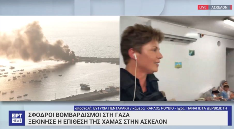 Η απεσταλμένη της ΕΡΤ στο Ισραήλ Ευτυχία Πενταράκη μαζί με τον καμεραμάν Κάρλο Ρούβιο και την ηχολήπτρια Παναγιώτα Δερβισιώτη μεταδίδουν εικόνες μέσα από καταφύγιο της Ασκελόν λίγα λεπτά μετά την έναρξη της επίθεσης με ρουκέτες από τη Χαμάς.