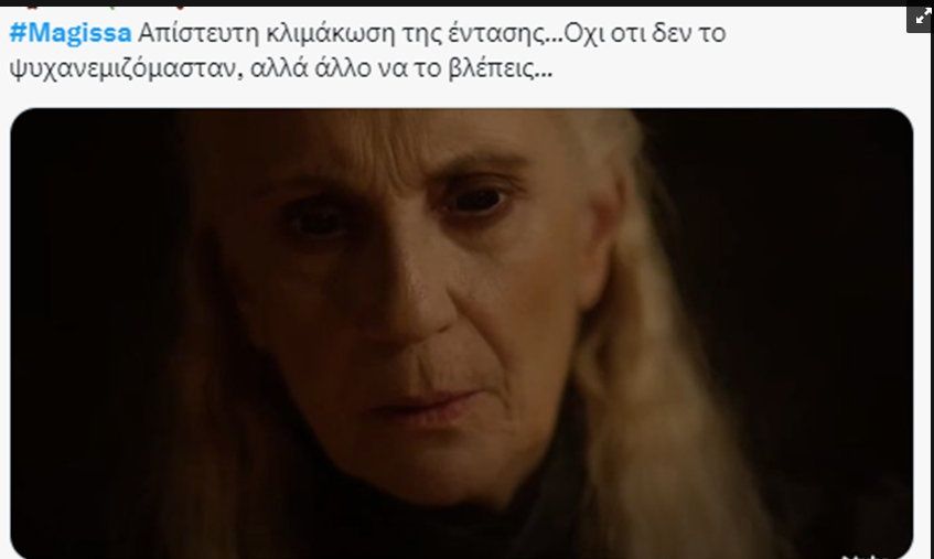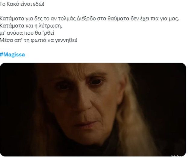 Όσο πλησιάζουμε στο τέλος του πρώτου κύκλου της επιτυχημένης σειράς του ΑΝΤ1 όλο και κορυφώνεται η αγωνία των τηλεθεατών για τους ήρωες που πολύ άξια υποδύονται οι πρωταγωνιστές. Ανάμεσά τους βέβαια και η Θέμιδα Μπαζάκα η οποία ως Κυπριανή, από την αρχή των εμφανίσεών της είχε μαγέψει, απόψε όμως πρόσφερε στο τηλεοπτικό κοινό μία μοναδική ερμηνεία, κάνοντας τους πάντες να υποκλιθούν στην υποκριτική της δεινότητα για ακόμα μία φορά. Το επεισόδιο (26/3) ήταν γεμάτο δράση, ένταση και ανατροπές, όμως οι περισσότεροι τηλεθεατές, αν κρίνουμε από τα σχόλιά τους στο Twitter, καθηλώθηκαν από μία από τις τελευταίες σκηνές. Συγκεκριμένα αυτή που η Κυπριανή, κατά κόσμον Θέμις Μπαζάκα, αποκάλυψε επιτέλους τον πραγματικό της εαυτό και έκανε ξόρκια για τη Θεοφανώ. Τα σχόλια έπεσαν… βροχή στο Twitter με αφορμή τη συγκεκριμένη σκηνή.