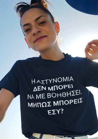 - Χθες η πρώην παίκτρια του Survivor φωτογραφήθηκε με μπλουζάκι που γράφει «Η αστυνομία δεν μπορεί να με βοηθήσει. Μήπως μπορείς εσύ;» κάνοντας έκκληση σε όσους την ακολουθούν στο instagram.Τις φωτογραφίες της συνοδεύει το παρακάτω κείμενο: