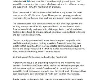«Δεν μπορώ να ξεκινήσω αυτή τη δημοσίευση χωρίς να πω ευχαριστώ σε αυτή την απίστευτη κοινότητα. Σε όλους όσους με έκαναν να νιώθω σαν στο σπίτι μου, δυνατή και υποστηρικτική – ΕΣΕΝΑ. Η καρδιά μου είναι γεμάτη ευγνωμοσύνη. Όταν ο κόσμος ρωτάει αν θα συνεχίσω να ζω στην Ελλάδα, η απάντησή μου δεν ήταν ποτέ περισσότερο ΝΑΙ. Εξαιτίας σου. Σας ευχαριστούμε που ανοίξατε τις πόρτες, τις καρδιές σας & τα σπίτια σας. Η καλοσύνη και η υποστήριξή σας σημαίνουν τα πάντα. Οι τελευταίες εβδομάδες ήταν μια περιπέτεια – γεμάτη αλλαγές, ανάπτυξη και νέες συναρπαστικές ευκαιρίες. Σε προσωπικό επίπεδο, μετακόμισα σπίτια, ενώ η Breathe συνεργάζεται επίσημα με το ίδρυμα του παίκτη του NBA Kevin Love, το Kevin Love Fund, για να φέρει κοινωνικά και συναισθηματικά εργαλεία μάθησης στην Ελλάδα και η ομάδα μας συνεχίζει να μεγαλώνει. Επίσης πρόσφατα συνεργάστηκα με μια νέα ομάδα για να επεκτείνω την πλατφόρμα μου στην υγεία & τη φιλοξενία – από τη φιλοξενία καταφύγων στην Ελλάδα μέχρι την έναρξη νέων πρωτοβουλιών που χτίζουν πιο υγιείς, πιο συνδεδεμένες κοινότητες. Γιατί αν υπάρχει ένα πράγμα που έχω συνειδητοποιήσει, είναι ότι ανεξάρτητα από το πόσο πράσινο χυμό πίνεις, χωρίς κοινότητα, δεν υπάρχει πραγματική υγεία. Λοιπόν, σας ευχαριστώ όλους που με κρατάτε υγιή. Η καρδιά μου είναι γεμάτη. Αυτή τη στιγμή, εστιάζω στην επέκταση των έργων μας και στην υποδοχή νέων εταίρων. Από τις ώρες στο Zoom αλλά και στην υγείας και ευεξίας (ναι, αυτό περιλαμβάνει ιδρώτα σε σάουνα υπέρυθρων! ), στην παραλαβή των πιο απίστευτων ελληνικών βιοδυναμικών προϊόντων από την ελληνική γη – αυτό είναι που με κρατούσε απασχολημένη και εμπνευσμένη. Και ανυπομονώ για το τι είναι μπροστά μου. Ευχαριστώ ιδιαίτερα όσους με βοηθούν να παραμείνω δυνατή -σωματικά, συναισθηματικά και με κάθε τρόπο που έχει σημασία. Εσείς τα σπάτε & είστε ο βράχος μου» γράφει!
