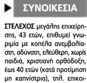 Όπως αναφέρει η αγγελία, «ΣΤΕΛΕΧΟΣ μεγάλης επιχείρησης, 43 ετών, επιθυμεί γνωριμία με κοπέλα ανεμβολίαστη, αδύνατη, ελεύθερη, χωρίς παιδιά, χριστιανή ορθόδοξη, έως 40 ετών (κατά προτίμηση μη καπνίστρια)».