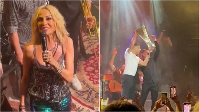 Η τραγουδίστρια τους ανέβασε στη σκηνή και πανηγύρισαν με το τρόπαιο. Σε άλλο σημείο, με τους μουσικούς της έπαιξαν τον ύμνο της Θύρας 7. Ωστόσο, με διάθεση για πειράγματα, η Άννα Βίσση, που έχει εκφράσει πολολές φορές την αγάπη της στους «πράσινους» έπαιξε και τον ύμνο του Παναθηναϊκού και σκόρπισε γέλιο στους θαμώνες.