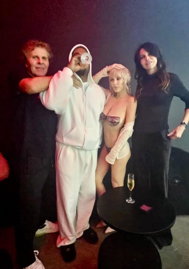 Ο Κάνιε Γουέστ φορούσε ένα λευκό φούτερ με κουκούλα και φόρμα μαζί με μαύρα αθλητικά παπούτσια, καθώς απολάμβανε ένα ποτό.