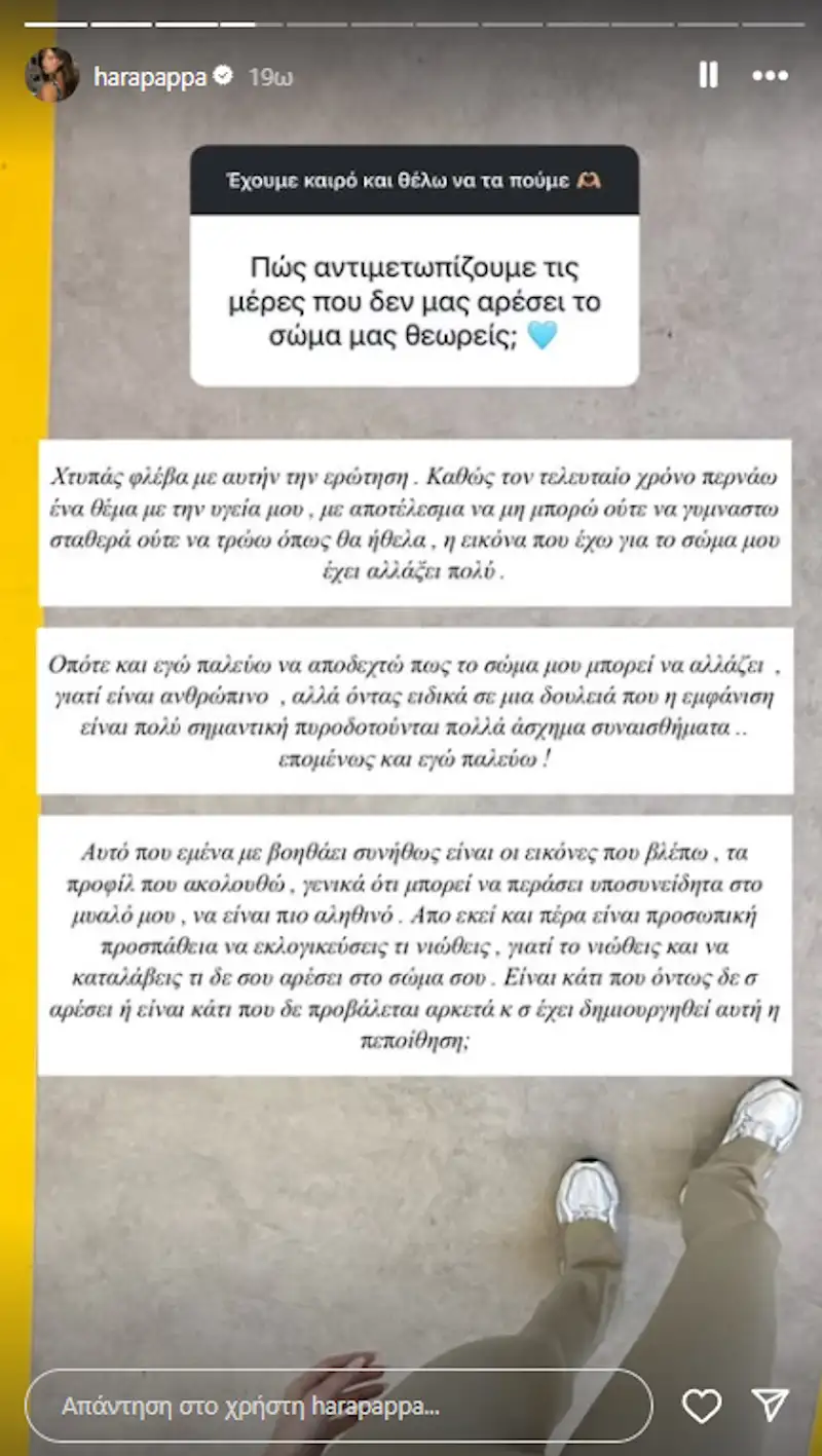 «Χτυπάς φλέβα με αυτήν την ερώτηση. Καθώς τον τελευταίο χρόνο περνάω ένα θέμα με την υγεία μου, με αποτέλεσμα να μην μπορώ ούτε να γυμναστώ σταθερά, ούτε να τρώω όπως θα ήθελα, η εικόνα που έχω για το σώμα μου έχει αλλάξει πολύ», έγραψε αρχικά στο story η Χαρά Παππα.