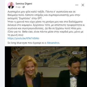 Το δικό της αντίο είπε η Σεμίνα Διγενή στον Ηλία Λογοθέτη που πέθανε χθες σε ηλικία 85 ετών: