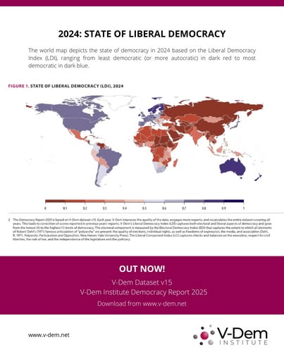 Η Ελλάδα κατατάσσεται από την έκθεση του V-Dem ως χώρα σε επιβεβαιωμένη πορεία αυταρχισμού (Confirmed Autocratizer), με σαφή και στατιστικά σημαντική πτώση στους δημοκρατικούς της δείκτες την τελευταία δεκαετία (2014–2024).