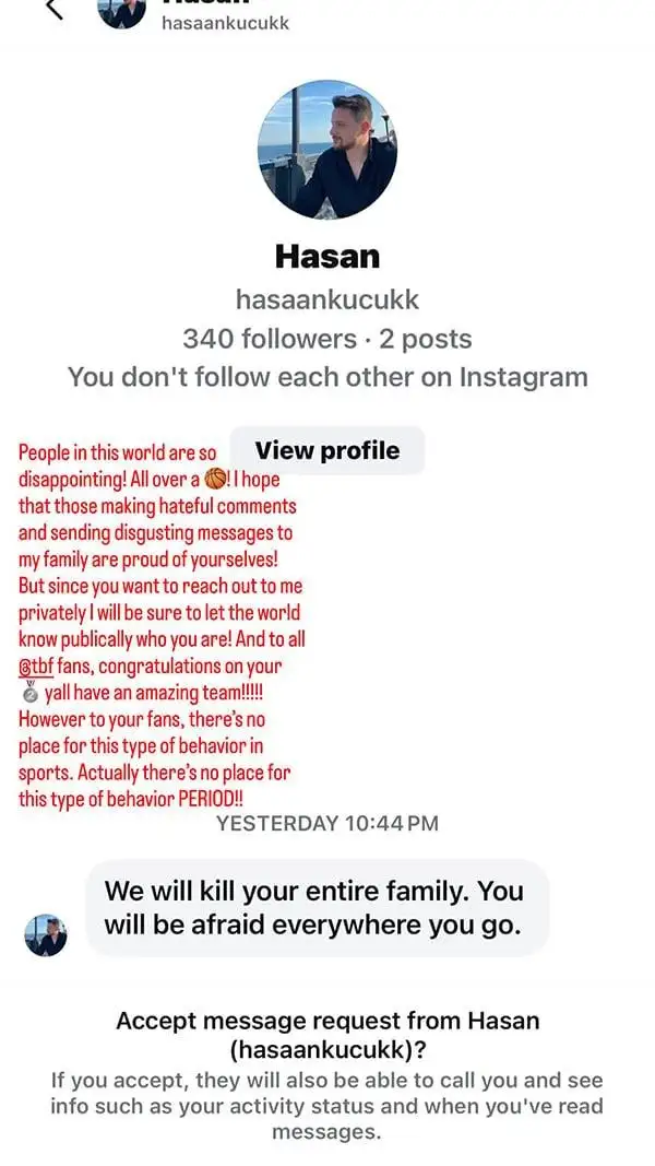 Η Μαράια έγραψε σε στόρι στο Instagram: «Οι άνθρωποι σε αυτόν τον κόσμο απογοητεύουν! Όλο αυτό για το μπάσκετ. Ελπίζω όσοι κάνουν σχόλια μίσους και στέλνουν αηδιαστικά μηνύματα στην οικογένειά μου να είναι περήφανοι για τον εαυτό τους! Αλλά επειδή θέλετε να επικοινωνήσετε μαζί μου ιδιωτικά, θα φροντίσω να ενημερώσω τον κόσμο δημόσια για το ποιοι είστε! Και σε όλους τους οπαδούς της Τουρκίας, συγχαρητήρια για το ασημένιο μετάλλιο σας, έχετε μια καταπληκτική ομάδα!!!!