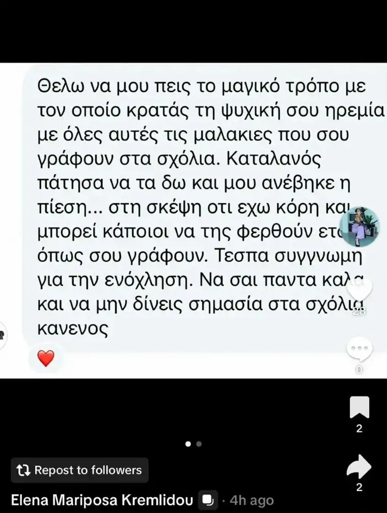 «Η ζωή είναι πολύ μικρή για να σταματήσω ή να κάνω πίσω επειδή κάποιος είπε κάτι. Εγώ θα συνεχίσω να ακολουθώ την ψυχή και τα όνειρά μου», κατέληξε στο μήνυμά της η Έλενα Κρεμλίδου.