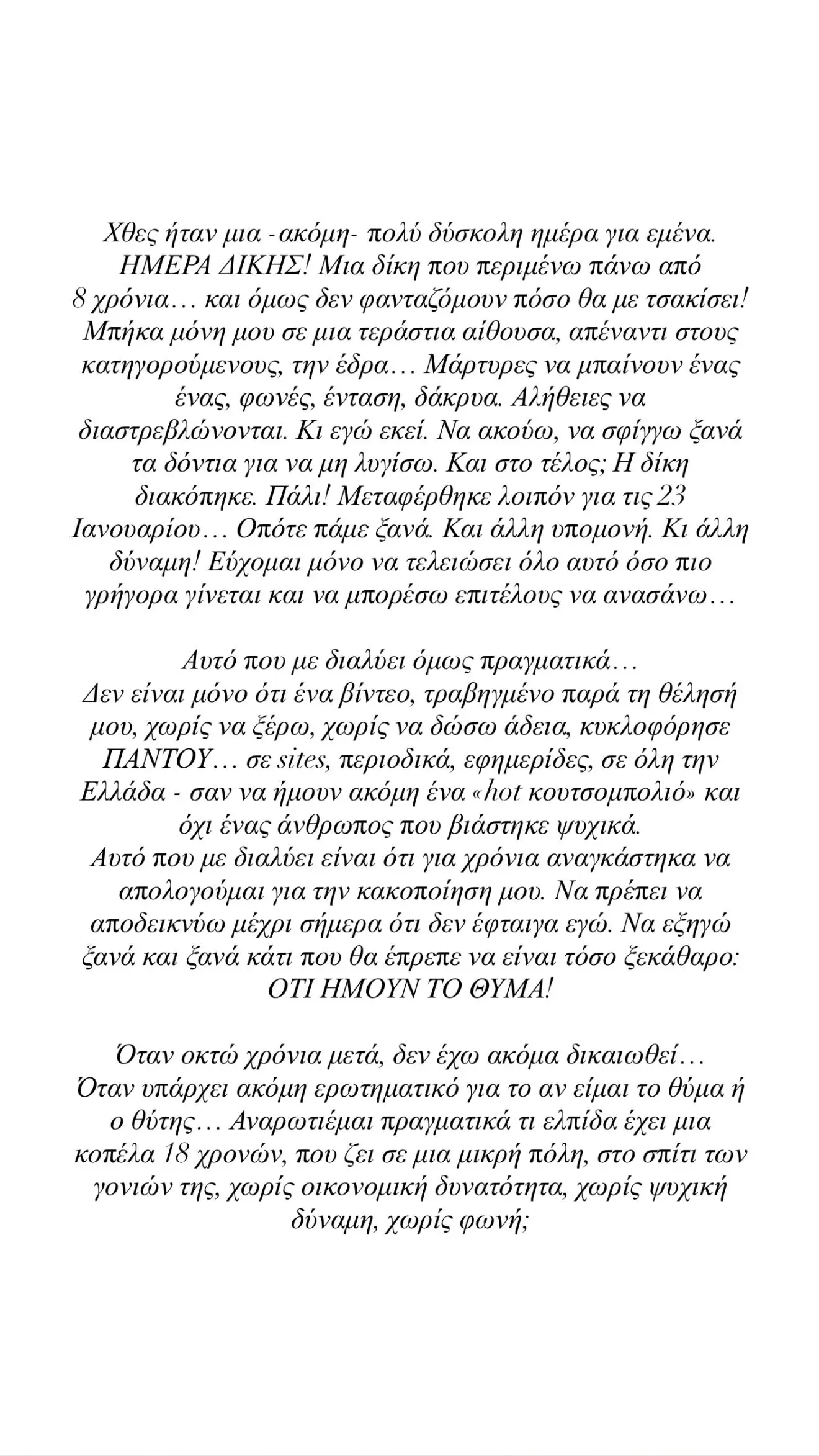 Όταν οκτώ χρόνια μετά, δεν έχω ακόμα δικαιωθεί… Όταν υπάρχει ακόμη ερωτηματικό για το αν είμαι το θύμα ή ο θύτης… Αναρωτιέμαι πραγματικά τι ελπίδα έχει μια κοπέλα 18 χρονών, που ζει σε μια μικρή πόλη, στο σπίτι των γονιών της, χωρίς οικονομική δυνατότητα, χωρίς ψυχική δύναμη, χωρίς φωνή;», έγραψε στο πρώτο από τα stories που δημοσίευσε η Ιωάννα Τούνη.