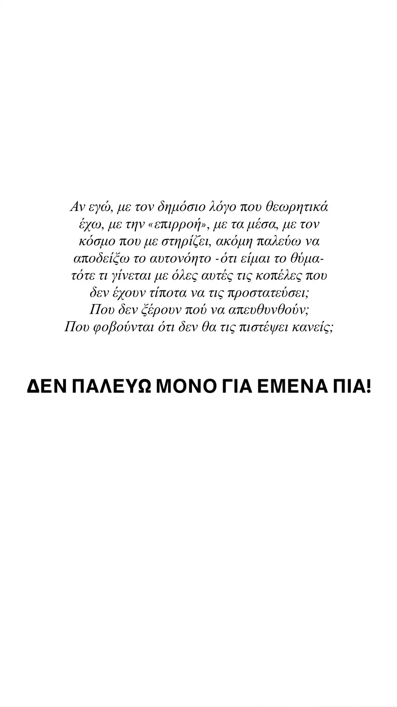 «Αν εγώ, με τον δημόσιο λόγο που θεωρητικά έχω, με την “επιρροή”, με τα μέσα, με τον κόσμο που με στηρίζει, ακόμη παλεύω να αποδείξω το αυτονόητο – ότι είμαι το θύμα-τότε τι γίνεται με όλες αυτές τις κοπέλες που δεν έχουν τίποτα να τις προστατεύσει;