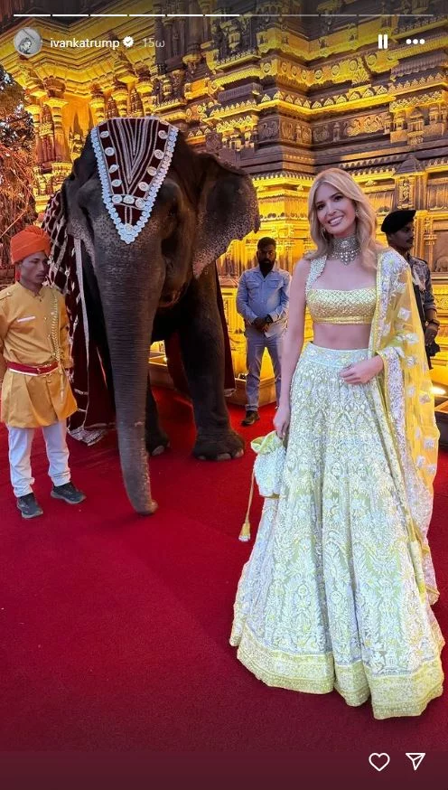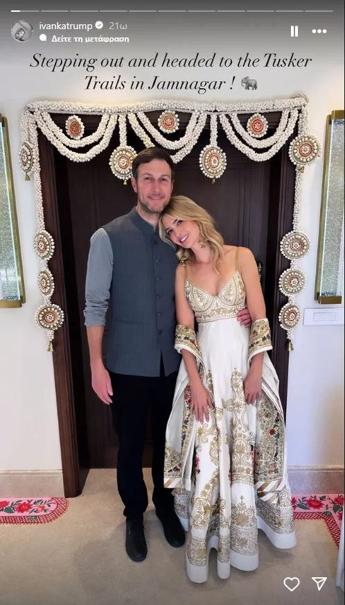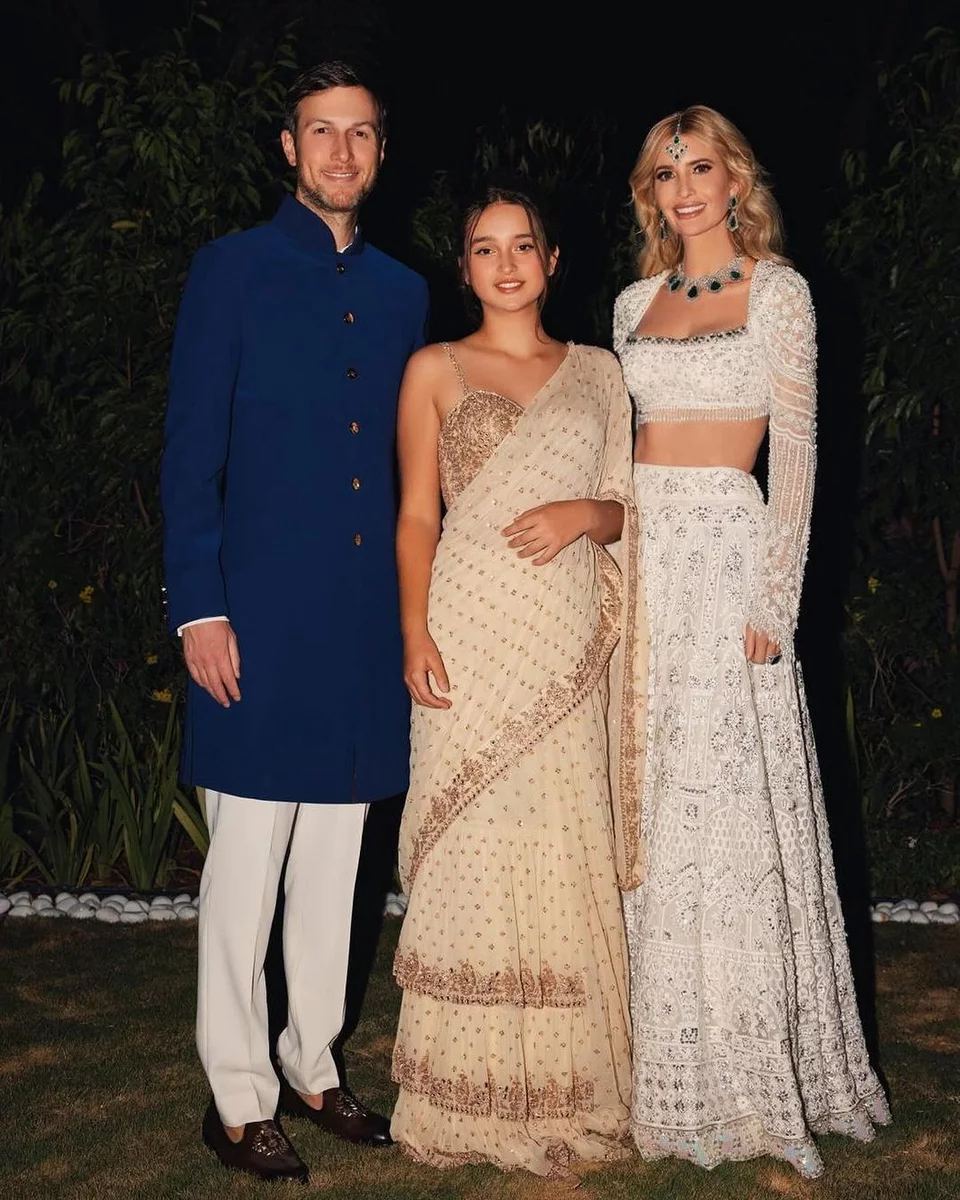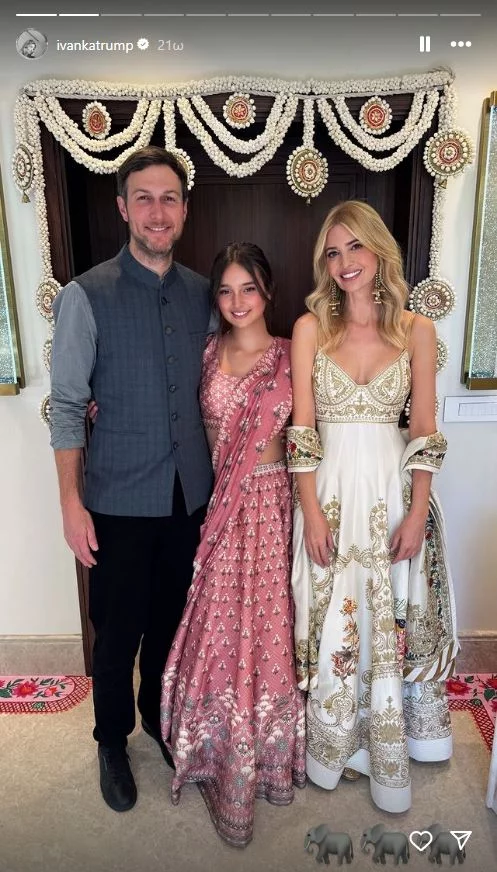 - Στέλνοντας θερμές ευχές στον Ανάντ και την Ραντίκα για ατελείωτη ευτυχία και αγάπη καθώς ξεκινούν αυτή την υπέροχη περιπέτεια μαζί». Στη συνέχεια, το πρωί της 2ας Μαρτίου, η πρώην πρώτη κόρη των ΗΠΑ μοιράστηκε άλλη μία από τις εμφανίσεις της καθώς και περισσότερες εικόνες από τους προγαμιαίους εορτασμούς. Στην λεζάντα έγραψε: «Ο εορτασμός της αγάπης του Ανάντ και της Ραντίκα συνεχίζεται τη δεύτερη νύχτα μας στην Ινδία». Σε αυτές, όπως μπορεί να δει κανείς, η οικογένεια Κούσνερ είναι ντυμένη με παραδοσιακά ινδικά κομμάτια, με την Ιβάνκα Τραμπ να φορά ένα λευκό δαντελένιο σύνολο του ίδιου σχεδιαστή με μερικά πετράδια στο κεφάλι, σκουλαρίκια και κολιέ. O Κούσνερ, εν τω μεταξύ, επέλεξε ένα μπλε σακάκι και λευκό παντελόνι, με την κόρη τους ένα μπεζ φόρεμα. Οι εορτασμοί έκλεισαν την Κυριακή, με την Ιβάνκα Τραμπ να μοιράζεται κι άλλες φωτογραφίες από το ντύσιμό της. Σε αυτές περιλαμβάνεται ένα κίτρινο και λευκό παραδοσιακό φόρεμα της Ινδίας που αποτελείται από δύο κομμάτια, με παγιέτες και πούλιες σε όλο το σύνολό του. Παρόμοιο είναι και πάλι το ντύσιμο της κόρης της Αραμπέλα. Και σαν να μην έφταναν όλα αυτά, πόσταρε φωτογραφίες και με ένα άλλο σύνολο – ένα λευκό φόρεμα με κεντημένες χρυσές λεπτομέρειες και πουλιά. Η κόρη της, αυτή τη φορά επέλεξε ένα ροζ σύνολο.