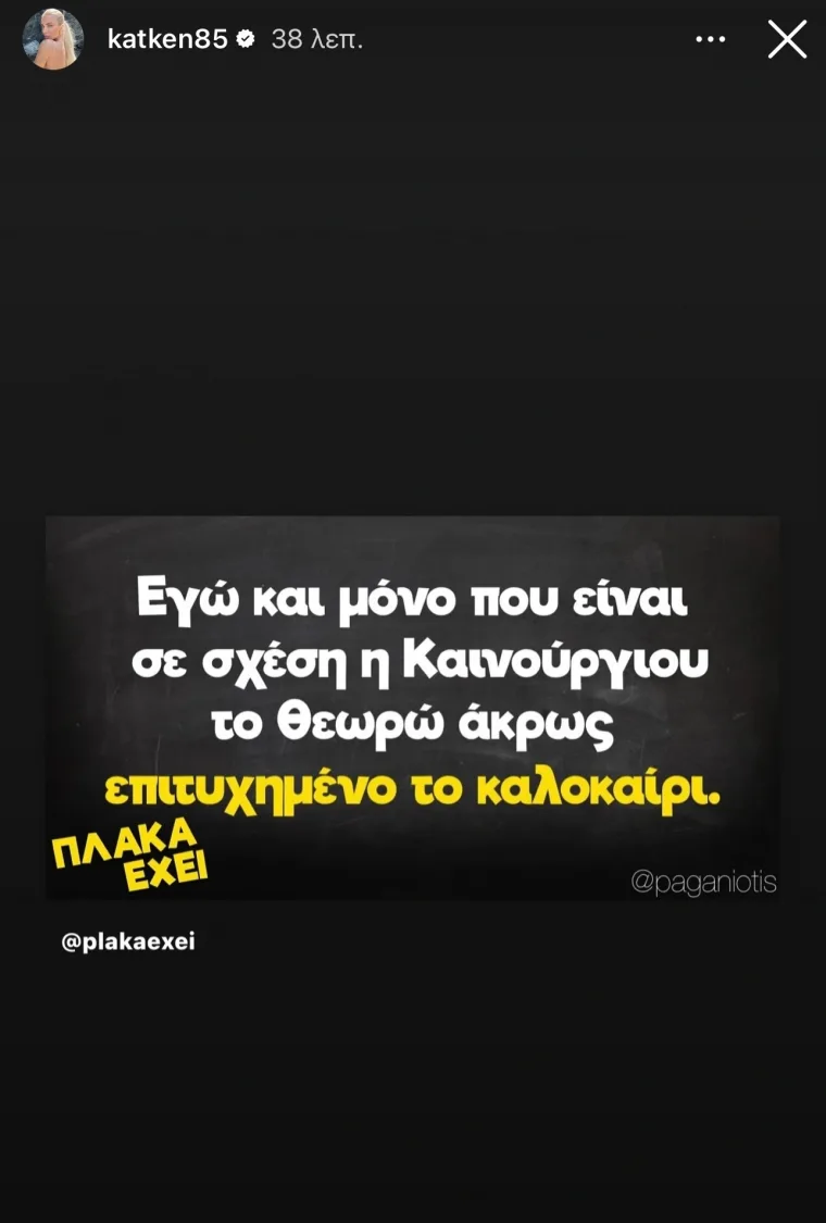Η φωτογραφία γράφει χαρακτηριστικά: «Εγώ και μόνο που είναι σε σχέση η Καινούργιου, το θεωρώ άκρως επιτυχημένο το καλοκαίρι»!