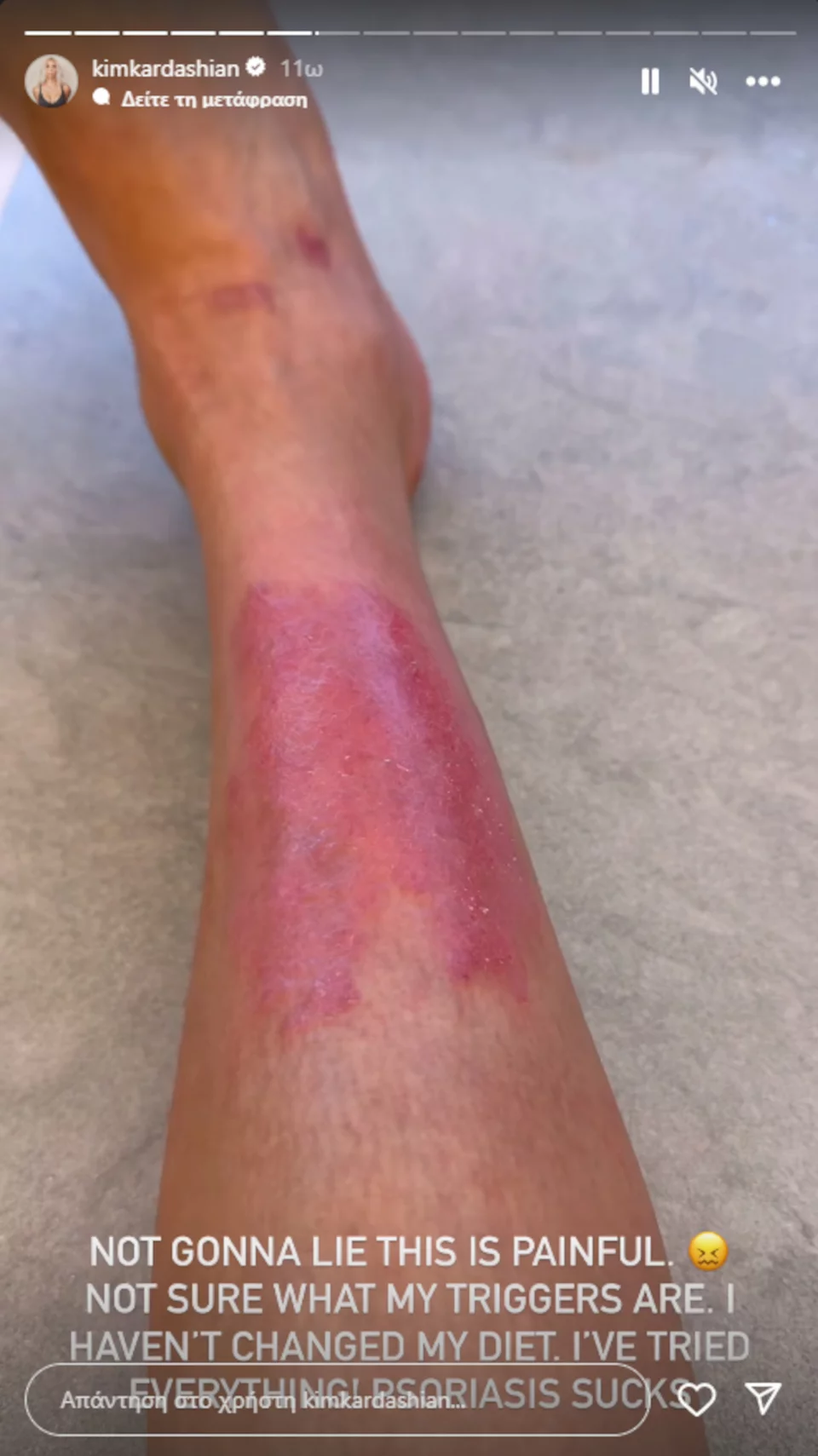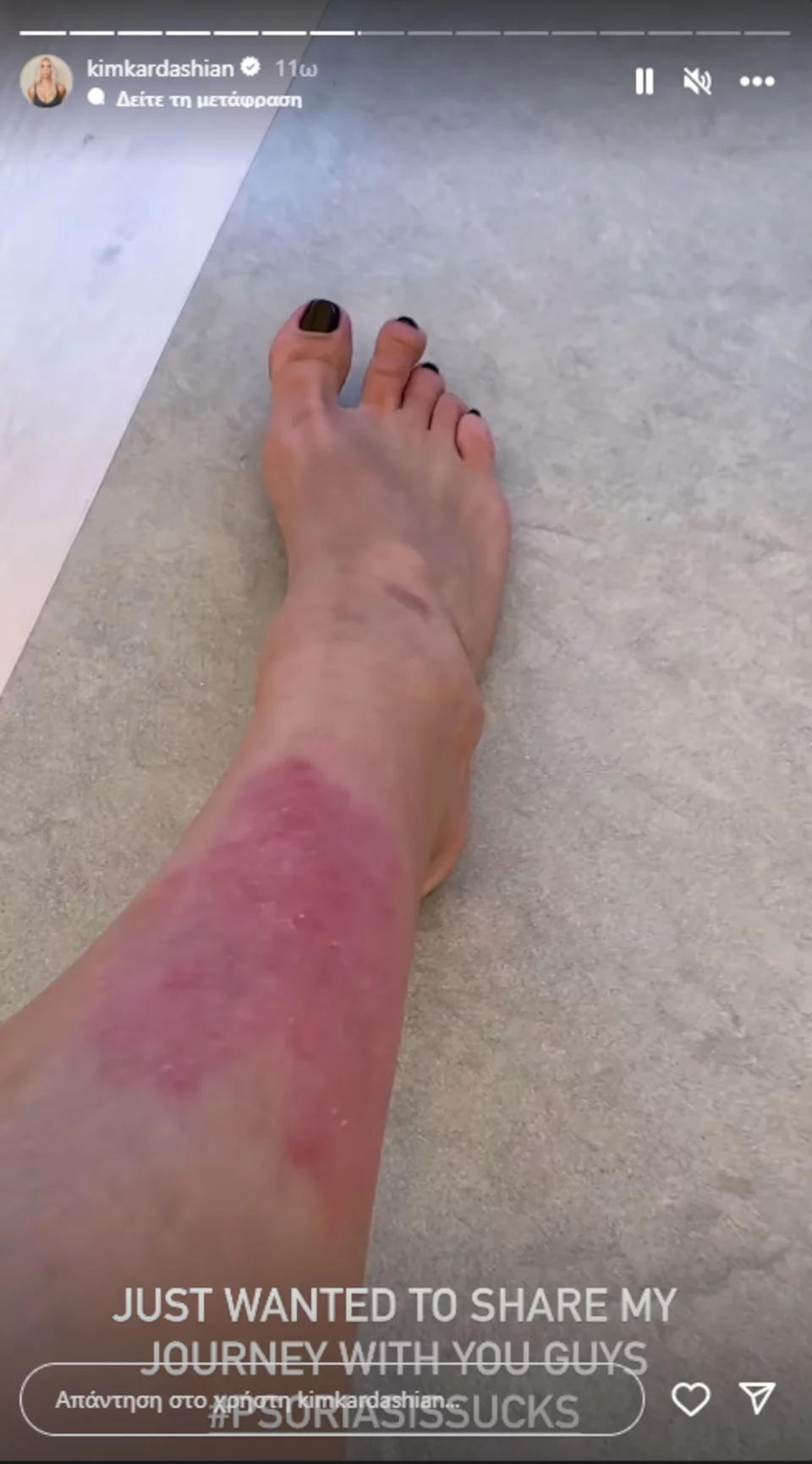 Η Κιμ Καρντάσιαν συνήθως μοιράζεται τη λαμπερή ζωή που κάνει ως celebrity, φορώντας ακριβά ρούχα και αξεσουάρ, ποζάροντας στον φακό και γενικότερα απολαμβάνοντας την πολυτέλεια και τη χλιδή. Αυτή τη φορά, όμως, η 43χρονη σταρ μοιράστηκε με τους διαδικτυακούς φίλους της κάτι διαφορετικό: τη χρόνια μάχη της με την ψωρίαση. Η Καρντάσιαν, η οποία διαγνώστηκε το 2011, ανέβασε ένα βίντεο με την τελευταία της «επώδυνη» έξαρση ψωρίασης στη δεξιά της γάμπα. Η ψωρίαση είναι μια αυτοάνοση διαταραχή που προκαλεί τον πολύ γρήγορο πολλαπλασιασμό των κυττάρων του δέρματος, με αποτέλεσμα ένα εξάνθημα στο σώμα, που είναι συχνά φολιδωτό, με φαγούρα και φλεγμονή. Η Κιμ είπε στους 364 εκατομμύρια ακολούθους της ότι δεν μπορεί να προσδιορίσει την αιτία της τελευταίας της έξαρσης και ότι ανεβοκατεβαίνει στο πόδι της. «Πόσο τρελή είναι η ψωρίασή μου αυτή τη στιγμή, παιδιά» αφηγήθηκε η Κιμ, καθώς έκανε ζουμ στο μεγάλο εξάνθημα.