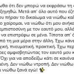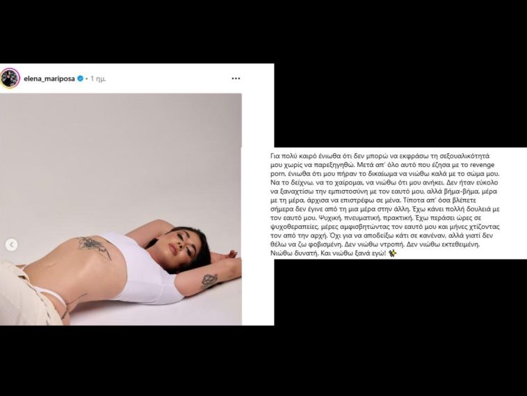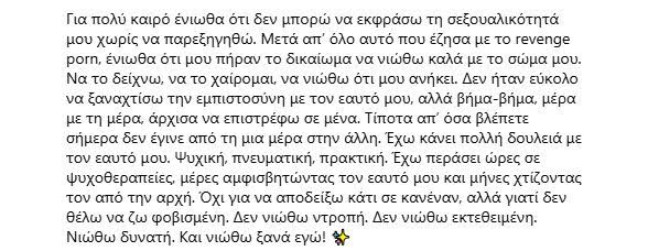 Χθες προχώρησε σε μια ανάρτηση που αναφέρει τα εξής «Για πολύ καιρό ένιωθα ότι δεν μπορώ να εκφράσω τη σεξουαλικότητά μου χωρίς να παρεξηγηθώ. Μετά απ’ όλο αυτό που έζησα με το revenge porn, ένιωθα ότι μου πήραν το δικαίωμα να νιώθω καλά με το σώμα μου. Να το δείχνω, να το χαίρομαι, να νιώθω ότι μου ανήκει. Δεν ήταν εύκολο να ξαναχτίσω την εμπιστοσύνη με τον εαυτό μου, αλλά βήμα-βήμα, μέρα με τη μέρα, άρχισα να επιστρέφω σε μένα. Τίποτα απ’ όσα βλέπετε σήμερα δεν έγινε από τη μια μέρα στην άλλη. Έχω κάνει πολλή δουλειά με τον εαυτό μου. Ψυχική, πνευματική, πρακτική. Έχω περάσει ώρες σε ψυχοθεραπείες, μέρες αμφισβητώντας τον εαυτό μου και μήνες χτίζοντας τον από την αρχή. Όχι για να αποδείξω κάτι σε κανέναν, αλλά γιατί δεν θέλω να ζω φοβισμένη. Δεν νιώθω ντροπή. Δεν νιώθω εκτεθειμένη. Νιώθω δυνατή. Και νιώθω ξανά εγώ!»