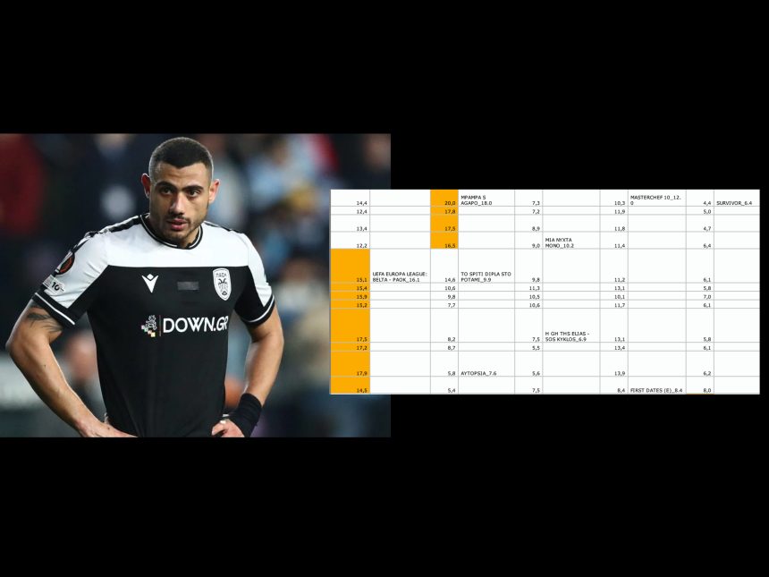 Το παιχνίδι του ΠΑΟΚ βρέθηκε μπροστά στο Prime Time, καθώς η σειρά του Alpha «Μπαμπά Σ’ αγαπώ» είχε μόλις ολοκληρωθεί, το “Survivor” παρέμεινε μονοψήφιο και το MasterChef κράτησε ψηλά το ενδιαφέρον. Το αποτέλεσμα;