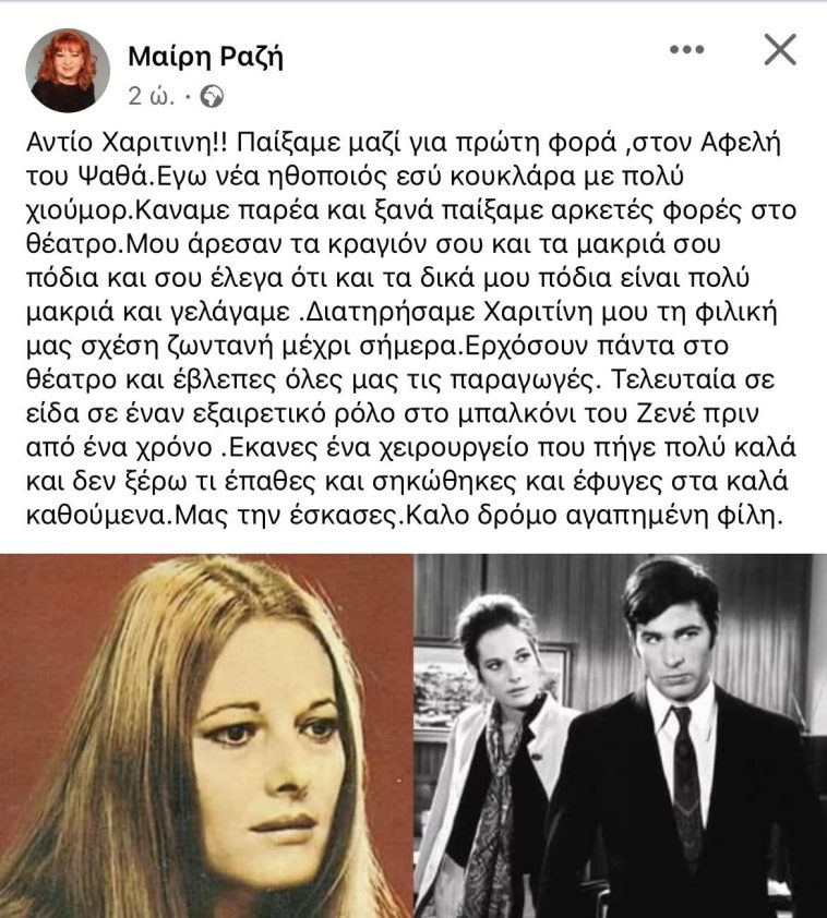 Συντετριμμένη είναι η θεατρική μετά τον ξαφνικό θάνατο της Χαριτίνης Καρόλου. Η Μαίρη Ραζή την αποχαιρετά με το παρακάτω κείμενο: