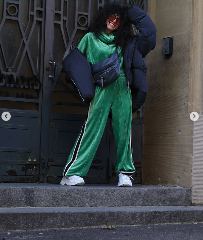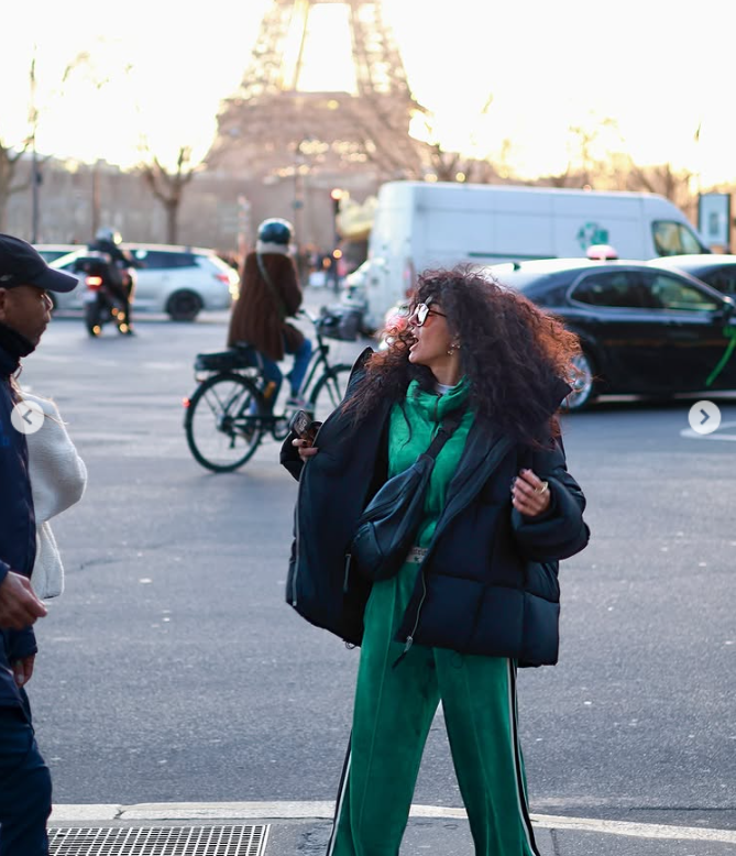 Σε χαλαρό και άνετο στιλ, εμφανίστηκε με πράσινη φόρμα και μαύρο μπουφάν, ολοκληρώνοντας το look με λευκά αθλητικά παπούτσια. Σε κάποιες φωτογραφίες ποζάρει χαμογελαστή στον φακό, ενώ σε άλλες χάνεται ανάμεσα στον κόσμο της γαλλικής πρωτεύουσας.