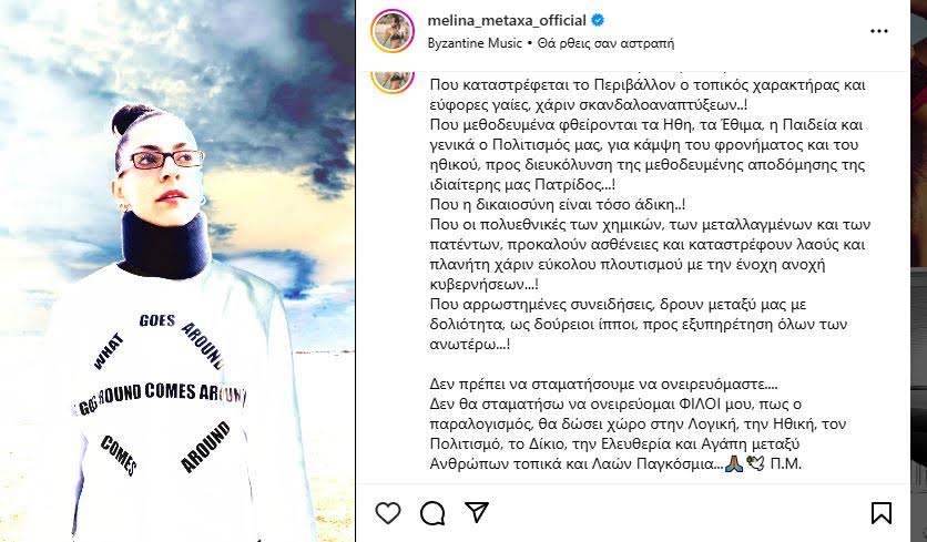 - Η Μελίνα, όπως ισχυρίστηκε φίλος της (με την ίδια να αναδημοσιεύει την ανάρτησή του), δέχτηκε βίαιη συμπεριφορά σε δημόσιο χώρο. Μέσα από το instagram δημοσιεύει εικόνες της και «μιλά» για πρώτη φορά με το παρακάτω κείμενο: