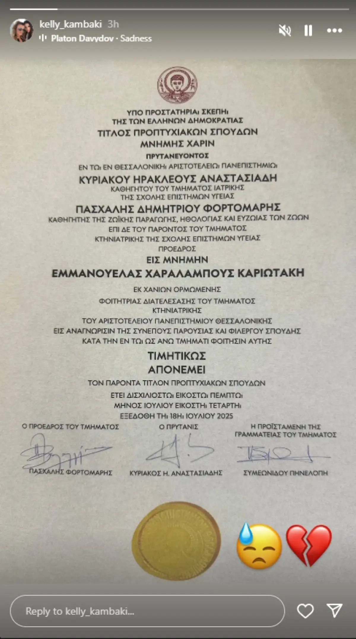 Τρία χρόνια μετά το τροχαίο δυστύχημα, η μητέρα της, Κέλλυ Καμπάκη, ανέβασε σήμερα (24.07.2025) σε story στο προσωπικό προφίλ της στο Instagram, το πτυχίο της κόρης της, το νήμα της ζωής της οποίας κόπηκε τόσο άδικα στην οδό Εγνατία στο κέντρο της Θεσσαλονίκης.