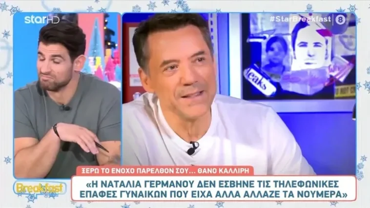 Στην εκπομπή «Breakfast@Star» παραχώρησε συνέντευξη ο Θάνος Καλλίρης. Ο γνωστός τραγουδιστής βρέθηκε στη στήλη «Ξέρω το ένοχο παρελθόν σου»! και έκανε αποκαλύψεις. Ο ίδιος μίλησε για την Ναταλία Γερμανού και τις σκηνές ζήλιας που υπήρχαν ανάμεσα τους όταν ήταν ζευγάρι..«Ξέρετε τι έκανε; Δεν έσβηνε την επαφή, έκανε το χειρότερο, άλλαζε τα νούμερα. Αν ήθελα εγώ να πάρω δεν έβγαινε, έβγαινε ένα κύριος» ανέφερε ο Θάνος Καλλίρης.