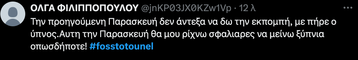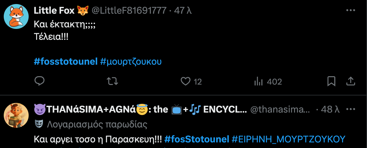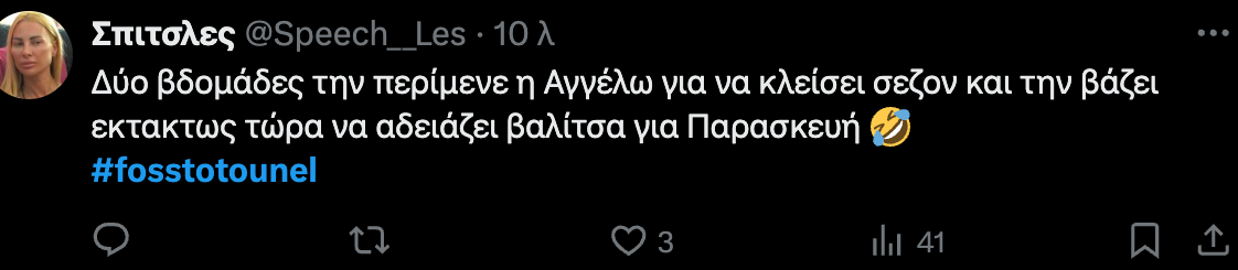 Από εκείνη τη στιγμή, το #fosstotounel τρεντάρει στο Χ και επικρατεί ένα παραλήρημα, ενώ οι τηλεθεατές ανυπομονούν και περιμένουν πώς και πώς να έρθει η Παρασκευή και να δουν τι θα έχει ετοιμάσει η αγαπημένη τους παρουσιάστρια.