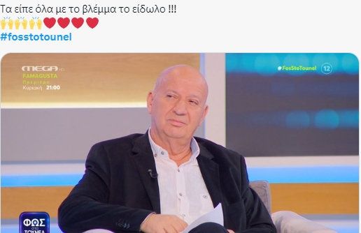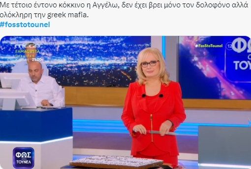 Το «Φως στο Τούνελ» και η Αγγελική Νικολούλη επέστρεψαν απόψε στο Mega για να ρίξουν φως στο θρίλερ του Μεσολογγίου. Άγνωστες λεπτομέρειες, παρασκήνιο και αποκαλύψεις που καίνε… Όλα όσα εμπιστεύτηκε ο αγνοούμενος σε πρόσωπο-«κλειδί» πριν ανοίξει η γη και τον καταπιεί. Τι αποκαλύπτει στην εκπομπή μάρτυρας που ήρθε πρόσωπο με πρόσωπο με τον κατηγορούμενο την ώρα που προσπαθούσε να «χτίσει άλλοθι»… Το ντοκουμέντο κάμερας εκείνη την νύχτα, γίνεται αδιάψευστος μάρτυρας… Από το πρώτο κιόλας λεπτό το hashtag της εκπομπής “σκαρφάλωσε” στη νούμερο ένα θέση του twitter με τα σχόλια τόσο για την εμφάνιση του Θανάση Κατερινόπουλου όσο και για το κόκκινο χρώμα στο κοστούμι της, πήραν “φωτιά”.