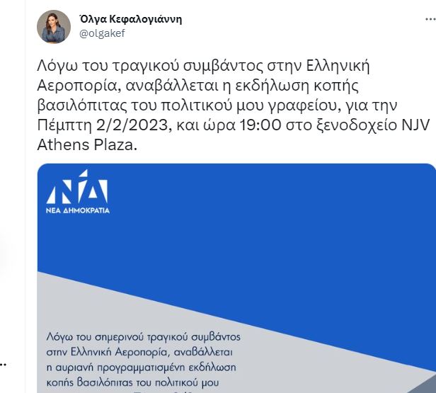 «Λόγω του τραγικού συμβάντος στην Ελληνική Αεροπορία, αναβάλλεται η εκδήλωση κοπής βασιλόπιτας του πολιτικού μου γραφείου, για την Πέμπτη 2/2/2023, και ώρα 19:00 στο ξενοδοχείο NJV Athens Plaza» γράφει η ίδια στο Twitter ακολουθώντας με την απόφαση αυτή… το πένθος των ημερών εξαιτίας της πτώσης του F4.